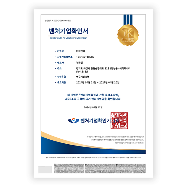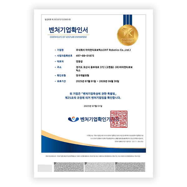 [인증] (주)아이앤티로보틱스 벤처기업확인서