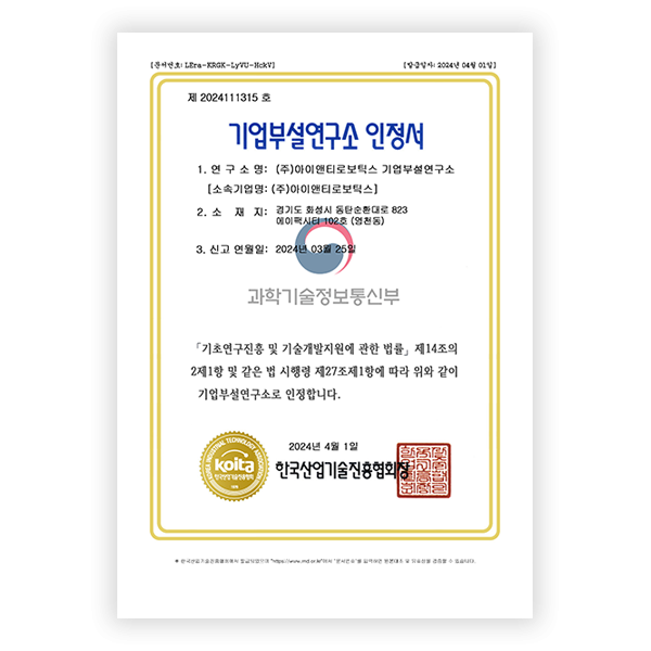[인증] (주)아이앤티로보틱스 기업부설연구소