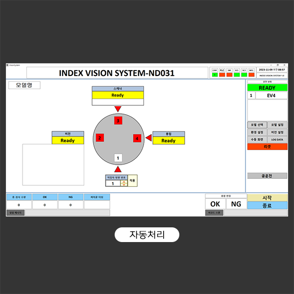 UI 화면 구성: 자동화면, 수동화면, 모델선택, 모델설정, 환경(스펙)설정, 비전설정, LOG DATA(작업이력)