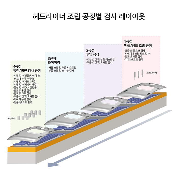 설명 본 제품은 자동차 내부 인테리어 트림 중 헤드라이너 제품의 각 공정별 조립 데이터를 관리하고, EOL 공정에서는 완제품에 대한 전수 검사(누락, 이종, 통전, 통신)의 수행을 목적으로 제작된 생산 라인 관리 시스템이다.
