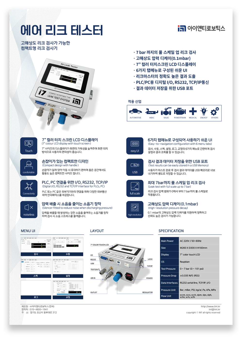 ㆍ아이앤티 자체 개발 에어리크테스터 제품 ㆍ고해상도 압력 디케이(0.1mbar) ㆍ7" 컬러 터치 스크린 LCD 디스플레이 ㆍ6가지 탭메뉴로 구성된 쉬운 UI ㆍ리크 마스터의 정확도 높은 결과 도출