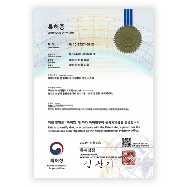 특허 이차전지용 캡 플레이트 어셈블리 조립 시스템 인증기관 특허청 특허출원일 2023-11-08 특허등록일 2024-11-04 페이지 정보 작성자 최고관리자 댓글 0건 조회 25회 작성일 26-01-28 17:27 목록으로 PREVIOUS다종 부품 정렬 공급을 위한 하이브리드 정렬장치 26.01.28 NEXT도어트림 무드램프 휘도 검사 시스템 26.01.28 본문 목록