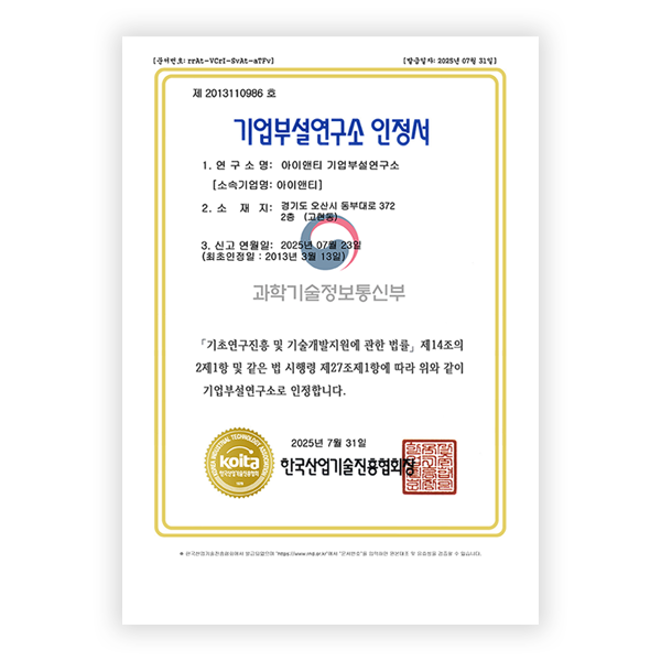[인증] 아이앤티 기업부설연구소