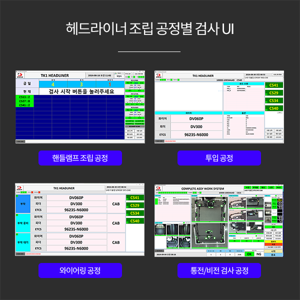 설명 본 제품은 자동차 내부 인테리어 트림 중 헤드라이너 제품의 각 공정별 조립 데이터를 관리하고, EOL 공정에서는 완제품에 대한 전수 검사(누락, 이종, 통전, 통신)의 수행을 목적으로 제작된 생산 라인 관리 시스템이다.