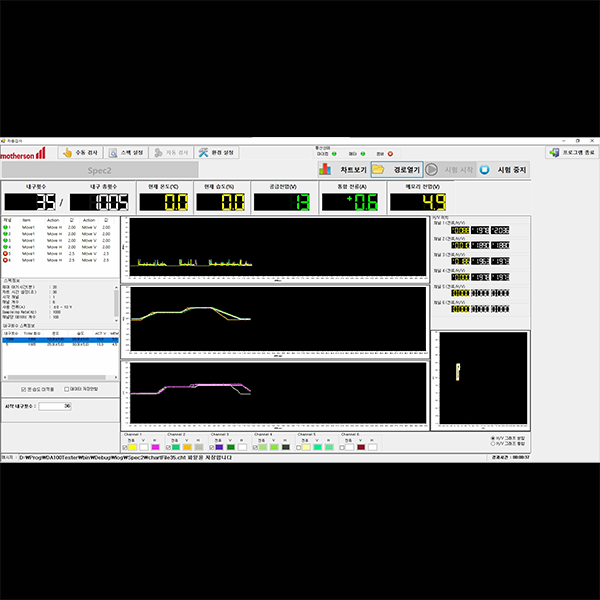 설명 본 장비는 자동차 사이드 미러 제품의 액츄에이터 메모리 전압을 측정 하는 장비로 최대 6 채널까지 동시에 측정 가능한 내구 시험기로 해당 제품을 챔버에 탑재하고 적절한 온도나 습도를 자동 조절하여 미리 지정한 위치로 액츄에이터를 이동하거나 Folding / Unfolding을 반복하도록 하며 시험을 하는 동안 각 채널별 전압 값을 그래프로 기록이 되는 장비이다.